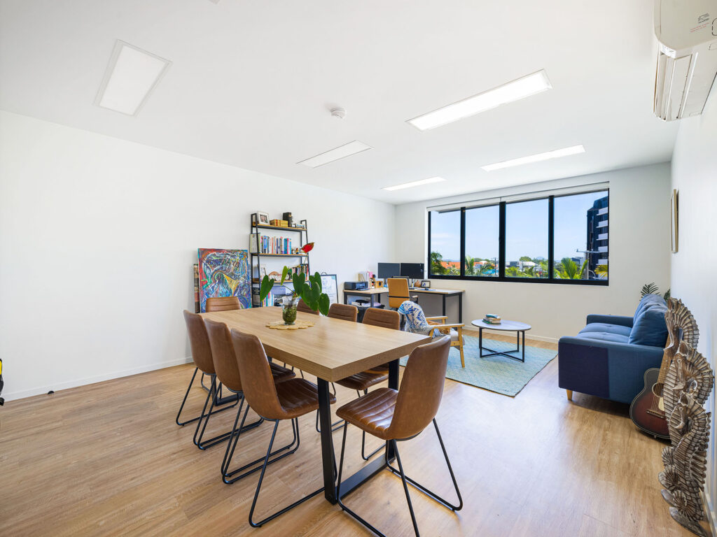 Designed for a modern lifestyle, the apartment features three bedrooms, two bathrooms and a generous open-plan living zone that flows to an expansive balcony. A large multi-use room offers the flexibility of a home office or second living area, ideal for those wanting a genuine live-work arrangement. The zoning allows both residential and commercial use, so running a home-based business is seamless.